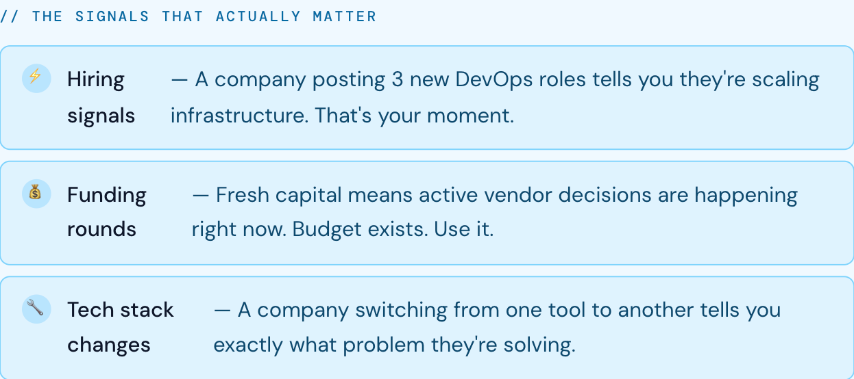 Your competitors are sending cold emails blindly. You’re sending them at the exact moment a company has a reason to listen. That timing gap is your entire advantage.