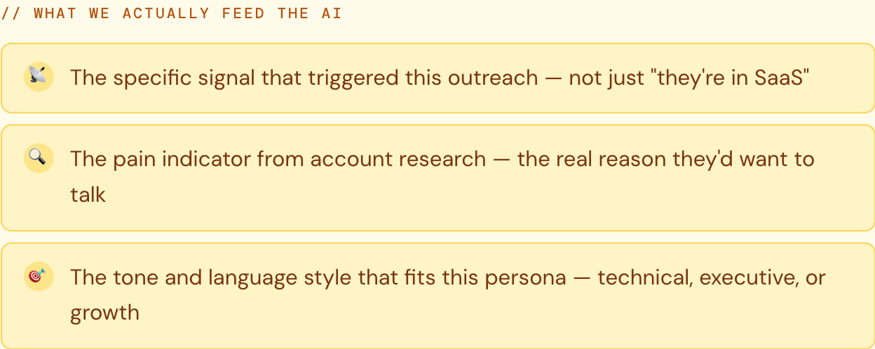 The problem isn’t AI. The problem is how most people use AI. They feed it a name and a company and ask it to “personalize.” We do something completely different.