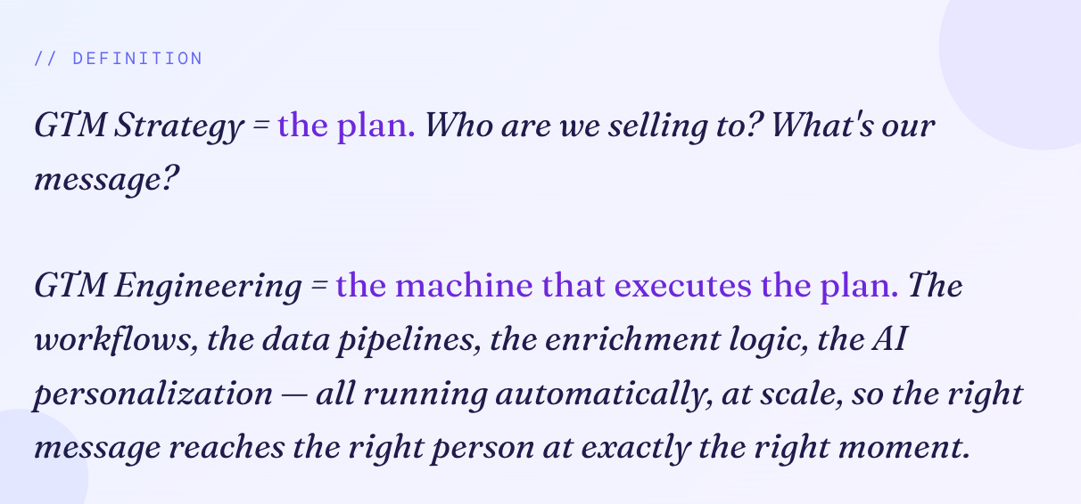 GTM stands for Go-To-Market. It’s the plan for how you reach your customers — who you target, what you say to them, when you say it, and how you say it. Most companies have a GTM strategy. Very few have a GTM engineering layer.
