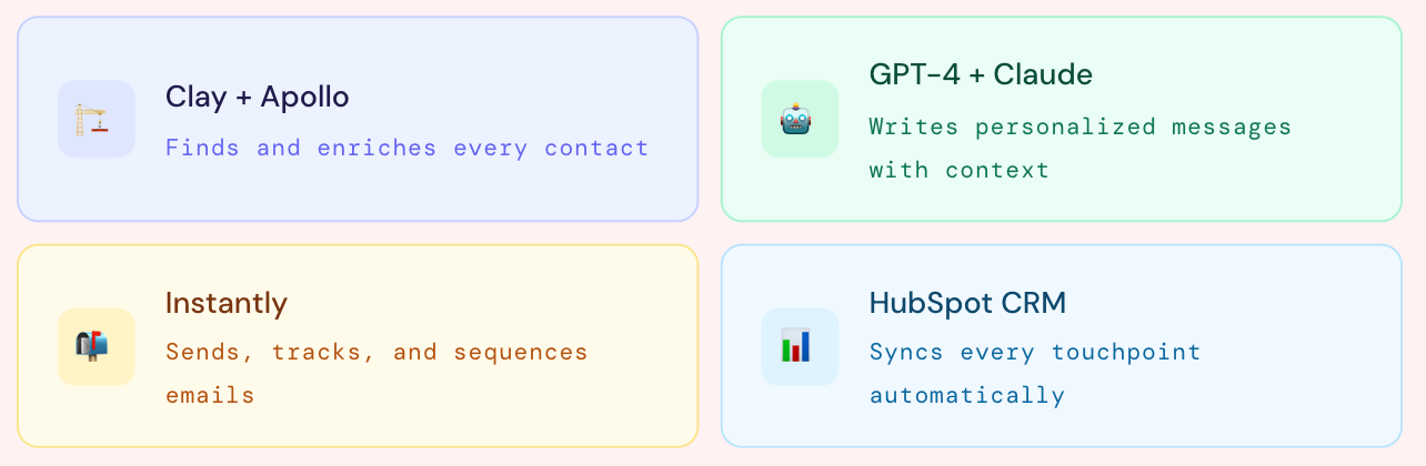 You don’t need a dozen tools. You need the right four, connected with the right logic. Here’s what we use, and what each one actually does:
