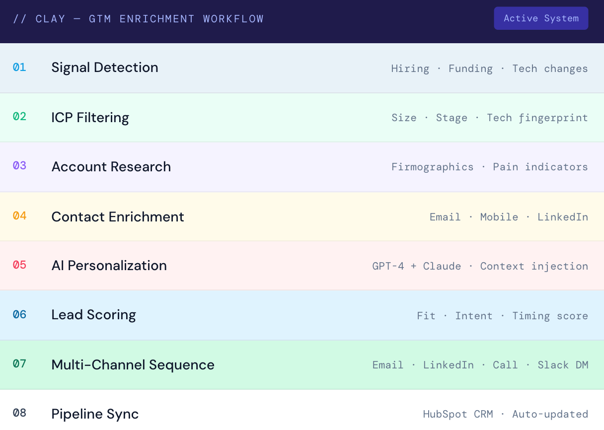 Now that you understand the pieces, here’s how they connect. This is the complete GTM Engineering workflow we build for every client, custom, not templated, running on Clay.